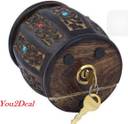 "A Handcrafted Wooden Barrel Shape Money Bank/Piggy Bank With Lock. Used by Children for Saving Money. A Perfect Birthday Gift For Kids. Product Specification: Product Code