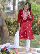 Women Chikan Embroidery Georgette Straight Kurta (Maroon)