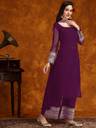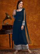 Kurta fabric-Georgette, Kurta length-Calf Length (46"Inch) , Kurta Pattern - Embroidered , Kurta Style-Straight , Bottom fabric-Santoon, Bottom Type-Palazzo, Dupatta Fabric-Georgette, Dupatta Length-2.50"inch