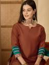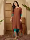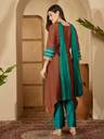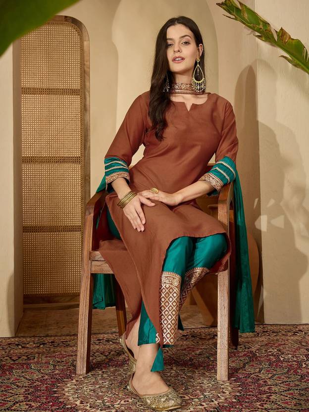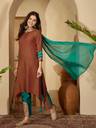 Elevate your ethnic wardrobe with this elegant Kurta Pant Set with Dupatta. Crafted from premium Cotton Silk fabric, the kurta features a chic notch choker dupatta and three-quarter sleeves accentuated with intricate embroidery and sequin detailing on the cuffs. The Asymmetric silhouette is designed for a graceful drape and contemporary appeal.