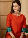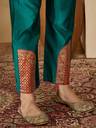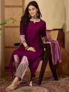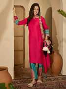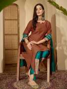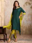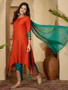 Elevate your ethnic wardrobe with this elegant Kurta Pant Set with Dupatta. Crafted from premium Cotton Silk fabric, the kurta features a chic notch choker dupatta and three-quarter sleeves accentuated with intricate embroidery and sequin detailing on the cuffs. The Asymmetric silhouette is designed for a graceful drape and contemporary appeal.