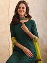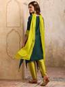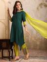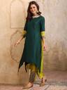 Elevate your ethnic wardrobe with this elegant Kurta Pant Set with Dupatta. Crafted from premium Cotton Silk fabric, the kurta features a chic notch choker dupatta and three-quarter sleeves accentuated with intricate embroidery and sequin detailing on the cuffs. The Asymmetric silhouette is designed for a graceful drape and contemporary appeal.