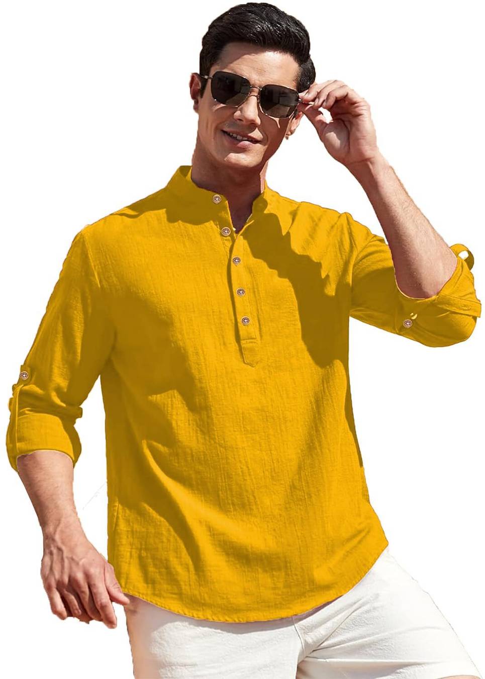 Elevate your style with the YUGNIK Men Cotton Blend Slim Fit Full Sleeve Short Kurta. Designed for men who value comfort and sophistication, this elegant beige kurta combines modern tailoring with timeless charm. Perfect for casual outings, festivals, or celebrations, it is crafted to suit every occasion. Key Features: • Fabric & Material: Made from Cotton Blend for breathable comfort and a super-soft feel. • Design: Solid beige color with a plain, minimalist look for versatile styling. • Fit & Closure: Slim fit with button closure for a tailored yet comfortable appearance. • Sleeve Style: Full roll-up sleeves for added flexibility and a trendy touch. • Collar & Hemline: Mandarin/Chinese collar paired with a curved hemline for a modern ethnic vibe. • Length: Short kurta style, perfect for pairing with both traditional and contemporary bottoms. How to Style This Short Kurta: 1. Casual Look: Pair with dark blue or black denim jeans and leather loafers for a laid-back yet polished appearance. 2. Traditional Ensemble: Combine with a pair of white or beige churidar for a festive or ethnic occasion. 3. Smart-Casual: Add chinos or straight-fit trousers, along with minimal accessories like a leather strap watch. 4. Layering Option: Layer it with a Nehru jacket or light ethnic vest for an added touch of sophistication. 5. Footwear: Pair with ethnic mojaris for a traditional look or sneakers for a modern casual outfit. Material & Care: • Material: Cotton Blend for ultimate comfort and durability. • Care Instructions: Suitable for both hand and machine wash. Use mild detergents for longer fabric life and avoid direct sunlight for drying to maintain the color. Why Choose This Kurta? • Versatile styling for casual and festive occasions. • Made from breathable, lightweight cotton for all-day comfort. • Tailored slim fit for a polished and trendy look. With YUGNIK’s Short Kurta, redefine your wardrobe with an effortlessly elegant style that merges tradition and modernity.