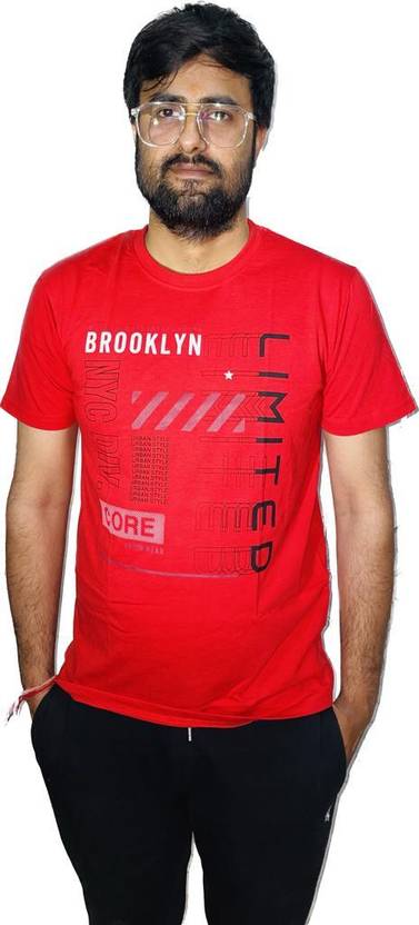 Men Printed, Typography Round Neck Cotton Blend Red T-Shirt