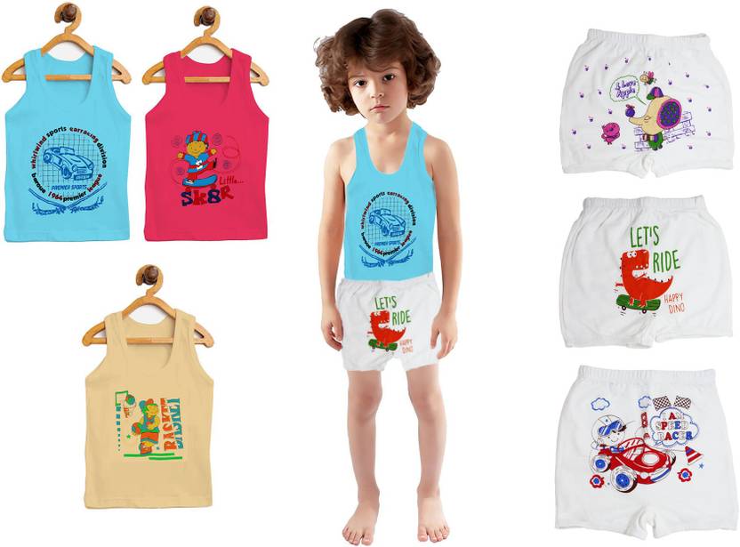 Yuneek presents printed sleeveless vest and brief combo for your little champ with quirky prints . This innerwear set is great to use as a layering piece and provide no-fuss dressing for kids. Made from soft cotton fabric which will help to keep your kid comfortable all day long :)