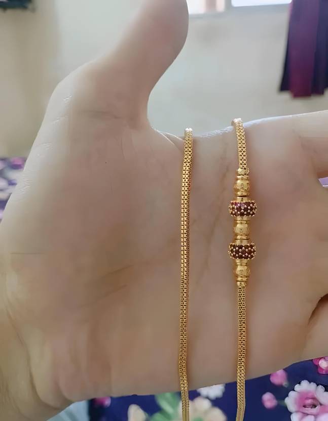 A Mugappu chain is a type of traditional South Indian gold chain, often associated with the mangalsutra, that features a distinct side pendant known as the "mugappu" or "side pendant". These decorative elements can be crafted from plain gold or feature intricate designs like nature-inspired motifs (such as peacocks or flowers), deities (like Goddess Lakshmi), or abstract patterns, often embellished with gemstones or stones. The mugappu pendant adds a unique, culturally significant, and versatile touch to the chain, making it suitable for various occasions.