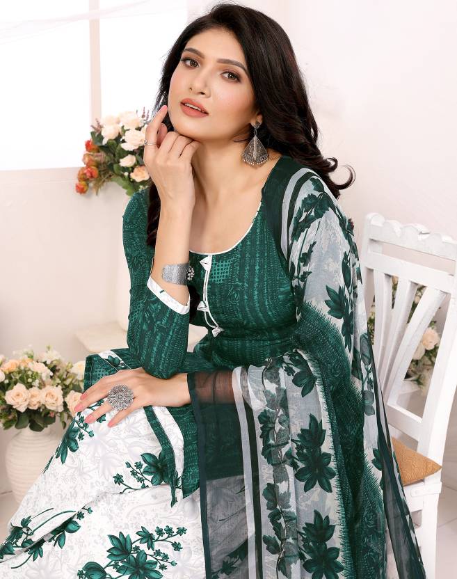 Flaunt a new ethnic look with this dress material. This Italian Leon Crepe suit is beautifully adorned with Print work comes along with solid Italian Leon Crepe bottom and martina chiffon dupatta makes it appear more adorning. Women can buy this suit to wear for their upcoming festivals, homely functions, parties, kitties, weekend get together. Get this unstitched suit stitched according to your fit and comfort. Team it with stylish accessories to make your looks more beautiful. Note:- The actual product may differ slightly in color and design from the one illustrated in the images when compared with computer or mobile screen.