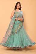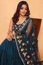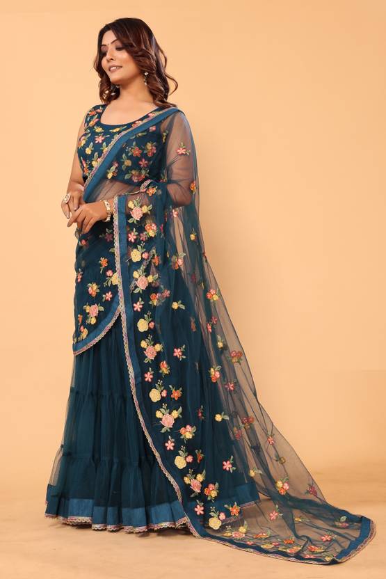 Saree Fabic :Lehenga Style Net fabric Saree and Free size Ready Made Blouse.....,,,,,,,, BLOUSE : Net embroidery work ready made blouse.Blouse bust size adjustable 30” to 40”....,,,,,, WORK : Beautiful multi coloured thread Floral embriodery work....,,,,,,,, Waist Fit :This saree’s waist adjustable upto 28inch to 42 inch....,,,,,, This saree have 16 meter flaired lehenga with 2.75 meter embroidered, ready lace pallu