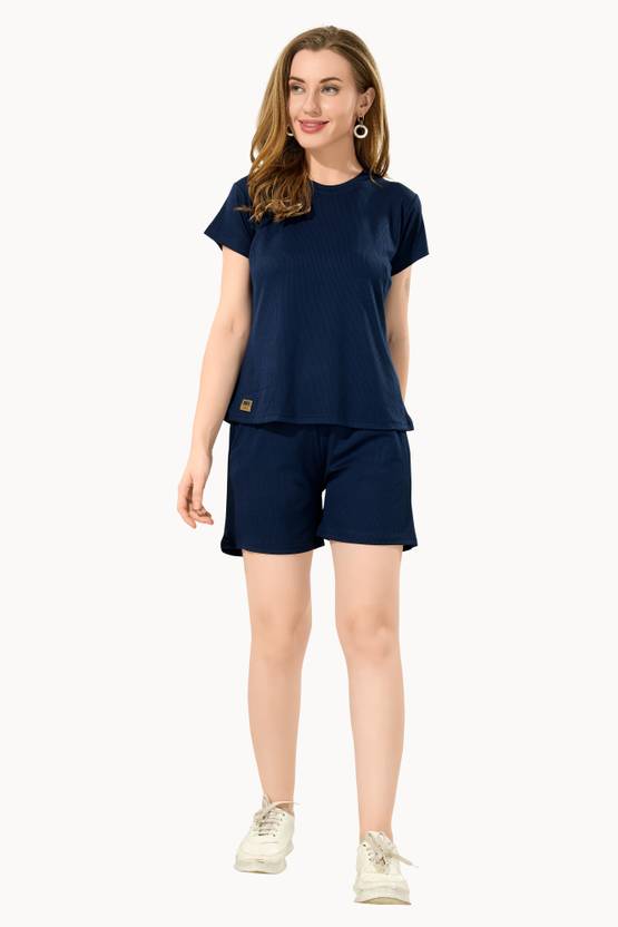 Women Top & Shorts Set Dark Blue Solid
