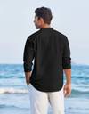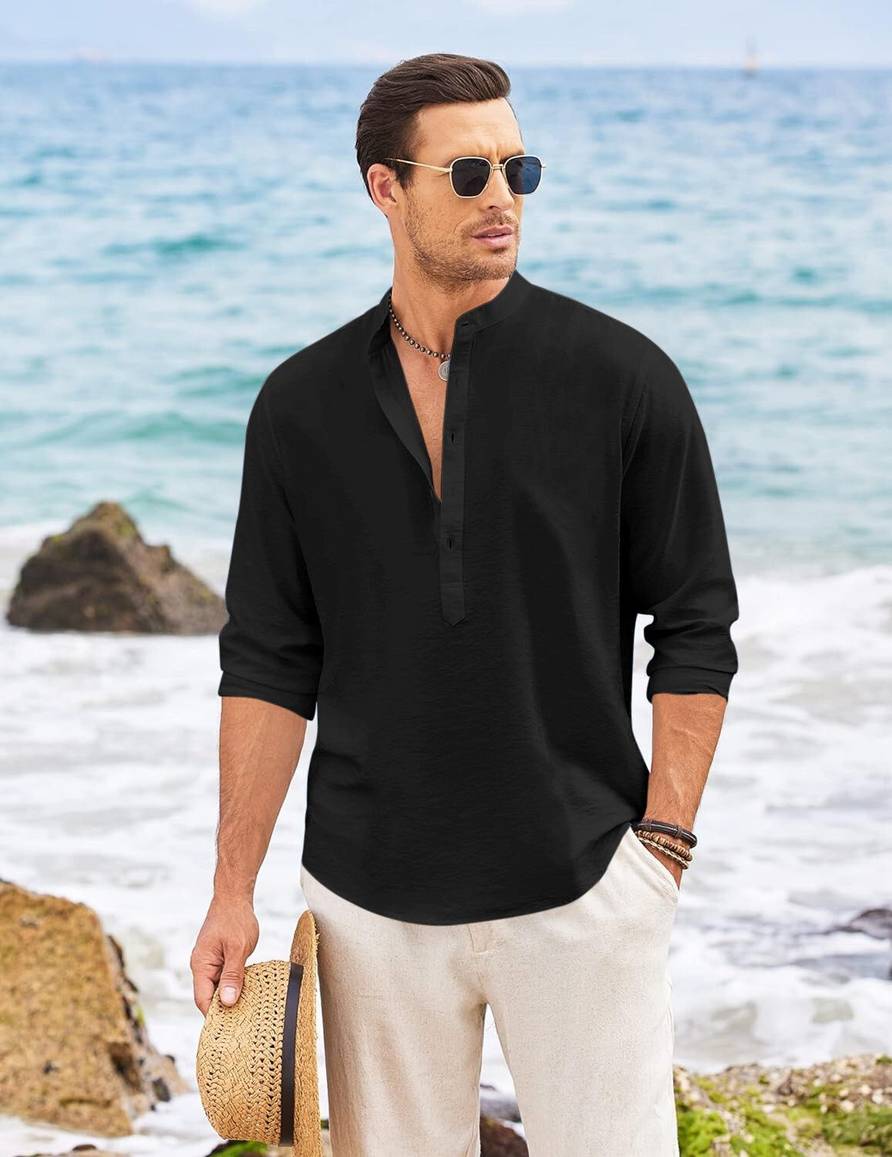 This men’s casual Henley shirt features a classic Mandarin collar with a partial button-down front placket. Designed in a solid black color, it exudes relaxed sophistication, perfect for beach outings or casual summer events. The shirt includes long sleeves with a roll-up style and is paired stylishly with light trousers for a breezy, minimal look.