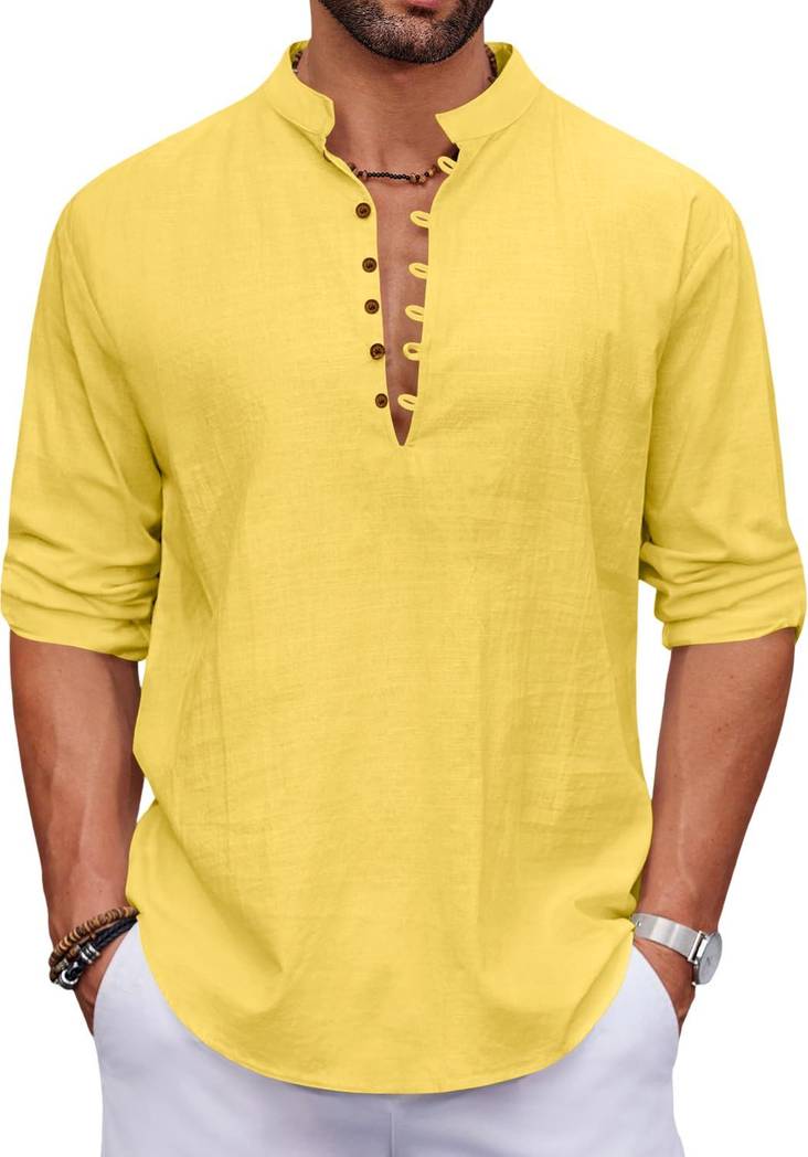 Men’s Split Neck Casual Shirt with Wooden Buttons & Rolled-Up Sleeves