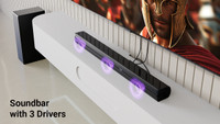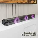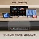 Integrated with Bluetooth v5.3, HDMI (ARC), USB, and AUX input compatibility, this soundbar offers seamless connectivity and enhanced audio experience with its various music streaming options.