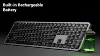 This keyboard features a built-in rechargeable battery, allowing for convenient and portable use.