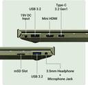 Take advantage of the laptop's intuitive connectivity, which includes 2 USB 3.2 ports, a mSD slot, a 3.5mm headphone and microphone jack, a DC power input, Type-C (for charging, data, & display out max. 1080p), and a mini HDMI port for video output.