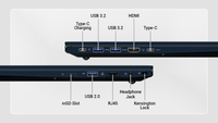 Take advantage of the laptop's intuitive connectivity, which includes 2 USB 3.2 ports, 1x USB 2.0, RJ45, a mSD slot, a 3.5 mm headphone and microphone jack, a Type-C port for charging, and another Type-C 3.2 Gen1 port (for data, and display output at a maximum of 1080p), HDMI port for video output. The Kensington lock on the side panel of the laptop is to improve privacy when not in use.