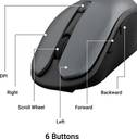 This compact mouse is equipped with six functional buttons, including a DPI switch, right and left clicks, a scroll wheel, and forward and backward navigation buttons.