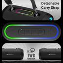 The speaker's vibrant look is enhanced by RGB LED lights, facilitating various lighting modes for a dynamic visual experience.