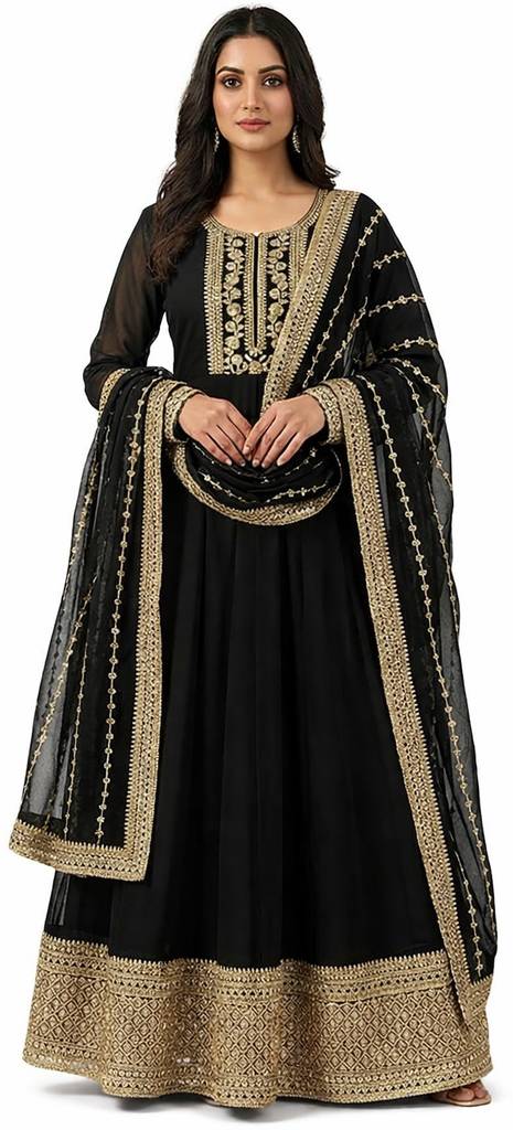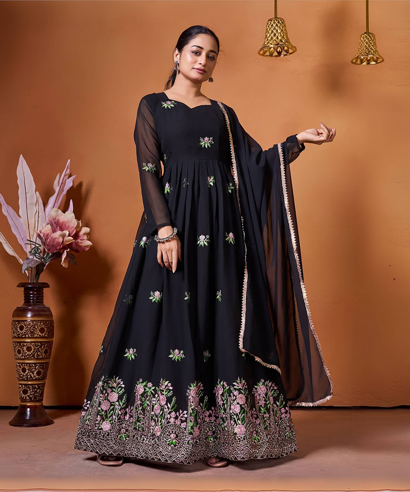 Solid, Embroidered Georgette Stitched Anarkali Gown (Black)