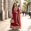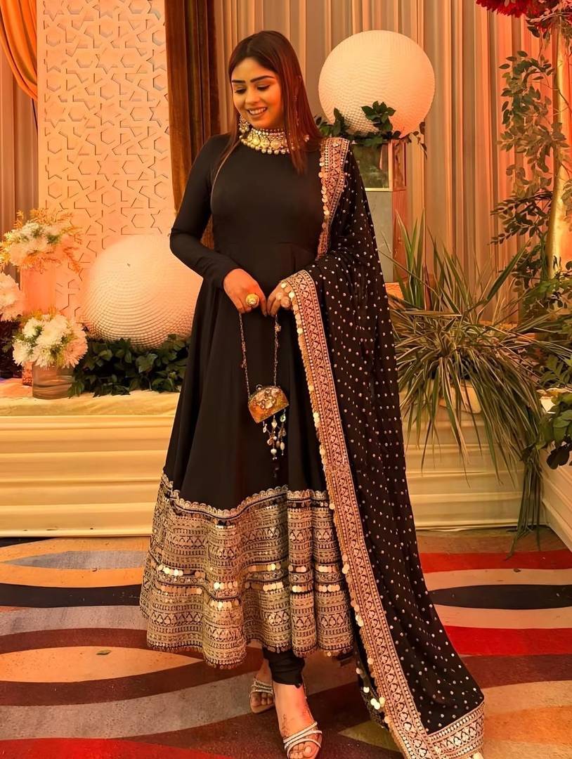 Make a statement at weddings and festive occasions with this beautiful black Anarkali gown. Made from heavy Fox Georgette fabric with embroidery and mirror work, this gown is fully stitched, comfortable, and ready to wear. A perfect blend of style and comfort.