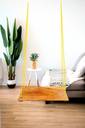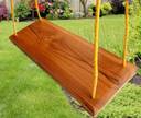Fresh Burma teak wood matte polished finish natural looking hanging swing for adults and 10+ years kids. **Instructions: Tie the center of 2 ropes to the roof or tree. Split 4 into 2 pairs and tie together the pairs separately about your waist height. Further split pairs to 1 and insert each hole on one side of the wooden chair, do the same for other side. Tie all 4 ropes behind the chair separately so that it won't come out of the hole. Ideal height of the swing is your knee. **Rope color may vary based on availability.