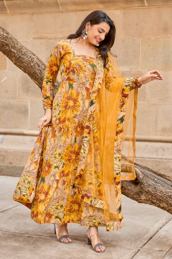 Step into 2025 festive vibes with floral cotton rayon Anarkali set—a stylish, ready‑to‑wear outfit that blends tradition with modern flair. This long Anarkali features a vibrant all‑over floral digital print, full sleeves, and a square neck that flatters many body types. Crafted from cotton rayon, it stays cool and breathable for day or evening events. The included net dupatta with lace border adds a graceful finishing touch, making this set ideal for parties, festival functions, or special family occasions. Pair with statement earrings and heels for a complete look.