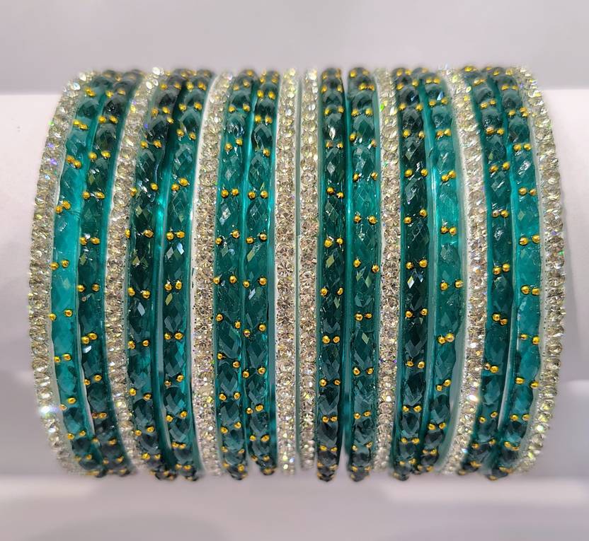 Stunning aqua teal crystal glass bangles with a faceted surface, Golden bead detailing along each bangle for a refined touch, Diamond-studded side bangles for extra brilliance