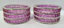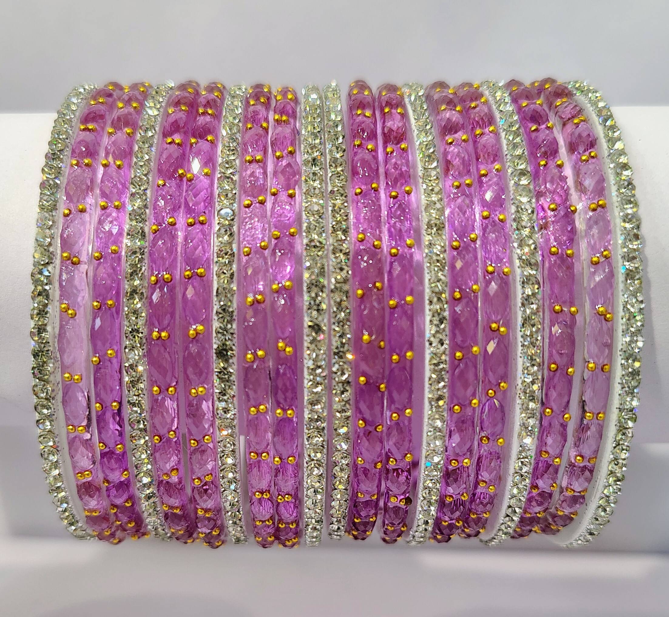 Elegant orchid purple / pink-toned crystal glass bangles, Faceted glass design with delicate golden bead accents, Side bangles encrusted with diamond-cut stones for brilliance