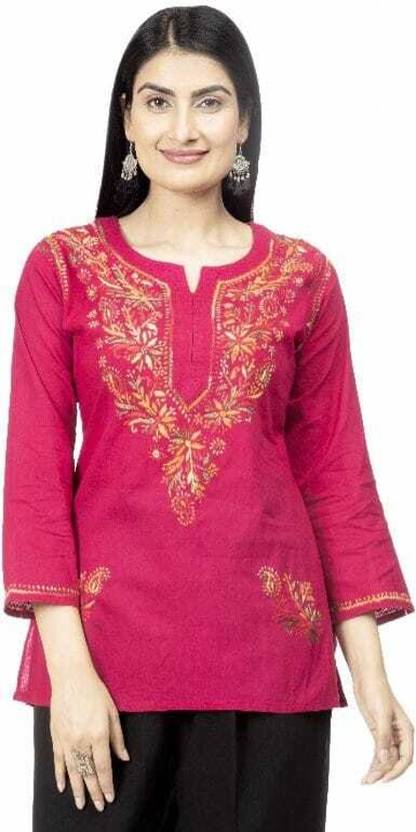 Women Chikan Embroidery Cotton Rayon A-line Kurta (Pink)