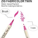 | Key Features | - [USABILITY] Ideal for decorating on fabrics such as T-shirts, sweatshirts, aprons, sneakers, canvas tote bags, and quilts. You can also use on paper and wood, and dual tips makes lettering, calligraphy, journaling, and crafting simple., [DUAL TIP MARKERS] ZIG Fabricolor twin has two different tip sizes; a 1mm tip for detailing and outlining, and a flexible brush tip for more complete coverage., [INK] Ink doesn't bleed and is resistant to discoloration and fading due to repeated washing. It is recommended to heat-treat fabric or other surface after use (when applicable), as heat setting on fabric with an iron will help preserve the ink. Drying time varies according to fabric., [QUALITY} Made in Japan, Water-based pigment. INK TYPE: Non-Opaque, Acid-Free, Lightfast, Odourless, Xylene Free.