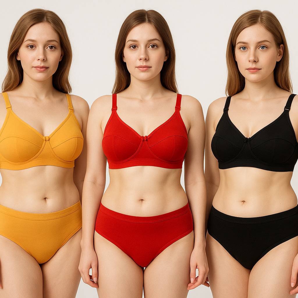 Woman's bra-panty set Full-coverage lingeri set Regular Bra .This cotton bra is provided with a fine mesh at the inner bust edge, and this improves air flow thereby providing you a lot of comfort and hides bulges, bumps and rolls thus making you look tight slim fit and trim. We provide good quality of bra and panty with heavy material and different types of colors Women and Girls Lingerie Sets.