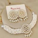 Material High-quality Alloy with Gold Plating, Color Gold & White (Dual-Tone), Type Necklace & Earring Set, Weight Lightweight (Approx. 50-70 grams), Finish Glossy, Reflective Shine, Package Contains 1 Necklace + 2 Earrings
