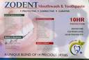 Zodent Mouthwash is a complete oral care liquid mouthwash that potent potent anti-inflammatory actions, Zodent Mouthwash removes over 99% of germs that cause bad breath and cavities, giving you a fresher and cleaner mouth than brushing alone. It has an extra refreshing peppermint flavour.This mouthwash contains no alcohol (non-alcoholic) hence does not cause any burning sensation when you use it. Yet it removes 99% germs instantly. You will experience an instant blast of freshness and 10X longer cooling sensation compared to brushing alone. This mouthwash gives you 24/7 control over bad breath with regular use. How to use: Fill the cap to its line (20ml). Rinse mouth with mouth wash thoroughly for 30 seconds, gargle and expel. Do not swallow. This mouth wash can be used by both men and women When to use: After brushing, An effective mouth freshner for your post meal needs.