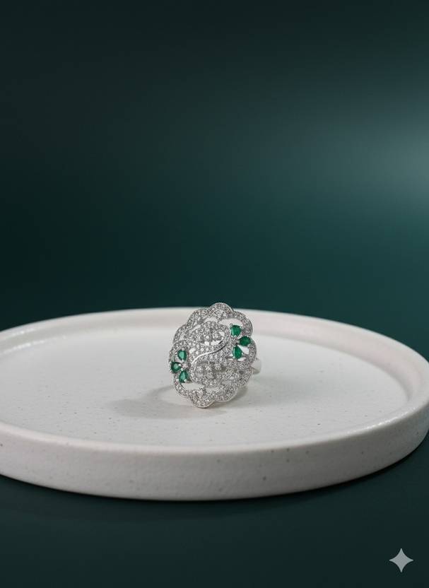 Add a touch of glamour to your jewellery collection with this stunning cocktail ring. Designed in an intricate scalloped pattern, it is embellished with dazzling American diamonds and highlighted with vibrant emerald-green stones for a regal appeal. The elegant craftsmanship makes it a perfect choice for parties, festive occasions, or as a statement accessory for special evenings. With its adjustable band, it ensures a secure and comfortable fit for all finger sizes.