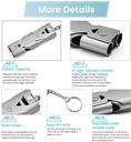 PREMIUM DURABIITY: The emergency whistles is crafted with premium stainless steel, fine finish, comfortable to touch, lightweight and durable.DUAL- HOLE HIGH DECIBEL WHISTLE: Crisp and loud double tubes emergency safety whistle. This high pitch whistle makes crisp sound and high pitch tone through the air viberation thanks to the dual air vents. Easy to make high pitch whistle sound, max up to 120db, even though in noise outdoor environement, the whistle can be heard clearly.PORTABLE KEYCHAIN DESIGN: keychain whistle is 57*18*9mm in size, also with a portable keychain, you can hang it on any hook, or carry it with you, attach the whistle on backpack, etc.ESSENTIAL OUTDOOR SURVIAL GADGET: Loud safety whistle is a essential outdoor activities gadget, can make you be found outdoor through safety survival whistles, and whistle is the best and easy way to save your energy and let people notice you when in emergency.MULTI PURPOSE WHISTLE: Emergency survival whistle is not just for outdoor adventure, but also can be used as a great whistle for referees, coaches, training, teachers, survival, emergency, school, gym, etc.DUAL- HOLE HIGH DECIBEL WHISTLE: Crisp and loud double tubes emergency safety whistle. This high pitch whistle makes crisp sound and high pitch tone through the air viberation thanks to the dual air vents. Easy to make high pitch whistle sound, max up to 120db, even though in noise outdoor environement, the whistle can be heard clearly.MULTI PURPOSE WHISTLE: Emergency survival whistle is not just for outdoor adventure, but also can be used as a great whistle for referees, coaches, training, teachers, survival, emergency, school, gym, etc.ESSENTIAL OUTDOOR SURVIAL GADGET: Loud safety whistle is a essential outdoor activities gadget, can make you be found outdoor through safety survival whistles, and whistle is the best and easy way to save your energy and let people notice you when in emergency.PREMIUM DURABIITY: The emergency whistles is crafted with premium stainless steel, fine finish, comfortable to touch, lightweight and durable.DUAL- HOLE HIGH DECIBEL WHISTLE: Crisp and loud double tubes emergency safety whistle. This high pitch whistle makes crisp sound and high pitch tone through the air viberation thanks to the dual air vents. Easy to make high pitch whistle sound, max up to 120db, even though in noise outdoor environement, the whistle can be heard clearly.