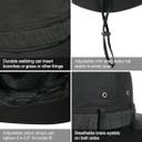 1. Fabric: The shell of this men's Boonie Sun Hat is made of 50% cotton and 50% polyester, with a mesh lining. It is lightweight, durable, and soft 2. It has an adjustable rope inside the sweatband, allowing you to customize the fit as needed 3. Adjustable Size: This casual-style men's fishing hat is available in 2 sizes. Size 7 1/8-7 1/4: Fits head sizes 22.4"-22.8"; Size 7 3/8-7 1/2: Fits head sizes 23.2"-23.6". Crown depth: approx. 3.7", Brim width: 2.5". Perfect for shade and protection from the sun on your face and neck 4. Features: Quick-drying fabric, cotton moisture-wicking sweatband, brass vents on both sides, adjustable chin strap, foldable for easy storage, slightly water-resistant in light rain 5. Usage Occasions: Ideal for outdoor activities such as fishing, hiking, camping, trapping, walking, picnics, beach, yard work, boating, bike rides, and more 6. Note: It may arrive with some creases due to shipping. A steam iron can easily remove most of these creases. While the hat is slightly water-resistant, it is not fully waterproof. Use caution in heavy rain
