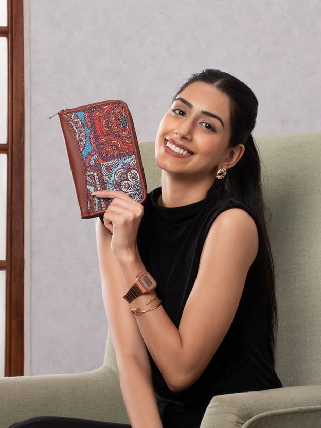 This is a Proudly Indian and 100% PeTA approved Vegan product with a Stylish Print. It is sturdy and durable with zipper closure. The inner main section contains 4 card slots, 1 slip pocket for keeping bills and invoices. It also has a zipper pocket partition to keep paper or cash and a buttoned pocket to keep coins.The backside has a zip pocket for quick access to items. The wallet can easily be carried in your hand.