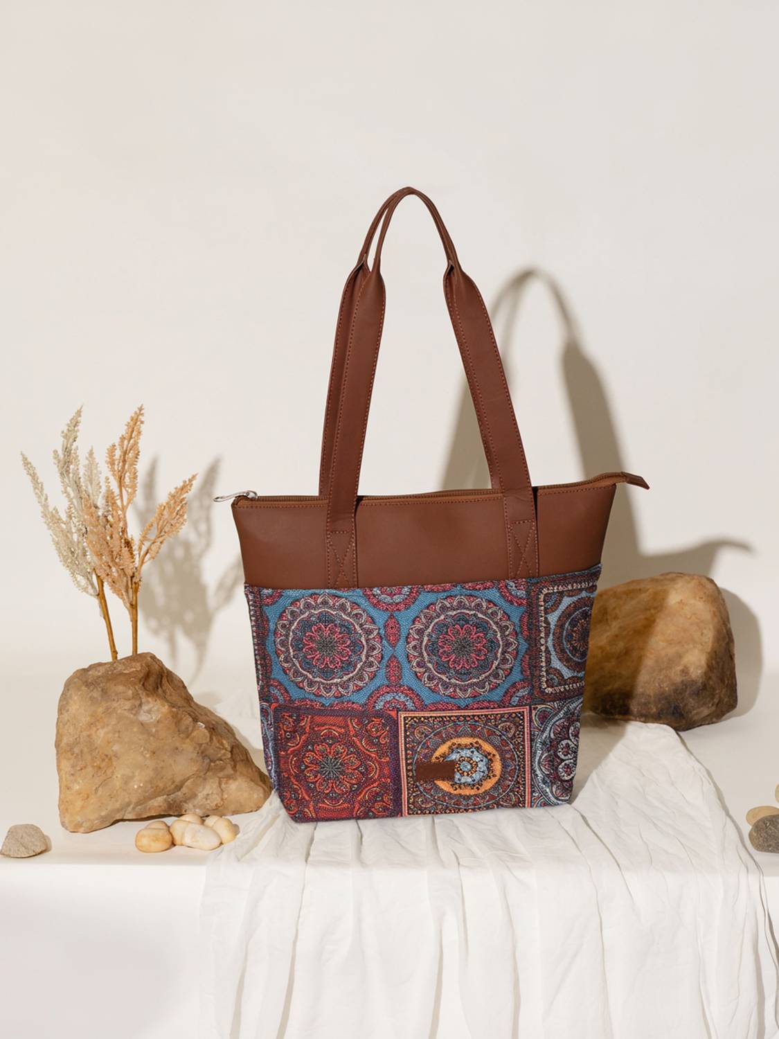 This is a Proudly Indian and 100% PeTA approved everyday tote bag, A blend of thoughtful functionality and minimal design, this tote is made to secure and streamline your essentials in your everyday endeavors. It offers plenty of room to store your daily essentials. Crafted with printed jute khadi and vegan leather, this durable tote which will complement your outfits and will offer effortless carry.