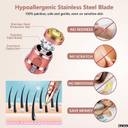 Featuring a hypoallergenic stainless steel blade, this hair remover ensures a safe and effective experience. The ergonomic aluminium handle provides a comfortable grip, while the stainless steel protection net further enhances safety. Also, thanks to its gentle and smooth operation, this tool prevents irritation, scratches, or redness, even on the most sensitive skin. Thus, you can rely on it to offer a painless hair removal experience.