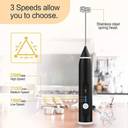 High Quality Milk Frother . The detachable whisking head is made of food grade premium stainless steel, easy to clean. The frother wand is made of food grade ABS with easy and comfortable grip. The built-in powerful low-noise motor brings strengthened speed rotation without disturbing your families and gives you a calm and tranquil morning Professional Kitchen & Barista Tool. There are 2 replaceable versatile whisks available. Choose the spring whisking head to make the perfect milk foam for your morning & afternoon coffee. And the ballon whisking head help you beat eggs & fluffy whipped cream. * USB Rechargeable Milk Frother. The handheld milk frother is powered by the built-in 1200mAh rechargeable lithium battery, without battery replacement, eco-friendly and saving your money. It also comes with a Android USB Cable, a fully charged takes 6 hours, convenient in daily use. 3 Speeds Adjustable Coffee Frother. Press the on/off switch to make the coffee frother work with blue light. Continue to press the on/off button, the speed will switch between low speed, medium speed and high speed. You could choose different speeds to achieve ideal frother effect. Note: please to use it in a tall bottle or deeper container to avoid splattered coffee or milk because of frother's strong motor! Premium Product with Elegant Looking: This milk foam maker uses advanced mixing pulse technology, which is low in noise and more durable. Beautifully styled in black to fit into any kitchen and look elegant. Simply press the button to turn on/off, easily make foam for coffee, all type milks, cream, cappuccino, matcha, hot chocolate.