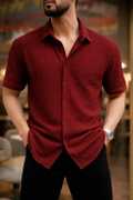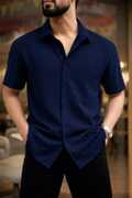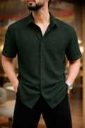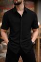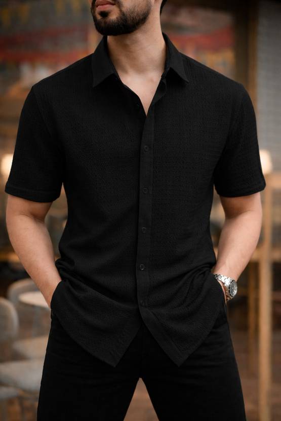 This is a black short-sleeved collared shirt with a textured, self-design fabric. It features a button-down front and a curved hem. This versatile shirt can be paired with jeans, chinos, or shorts for a smart casual look.