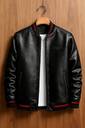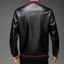 Men’s faux leather jacket with knit ribbed cuffs, hem, and collar. Features a front zip closure, sleek design, and soft inner lining for a comfortable and stylish fit.
