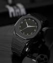 The matte black finish dominates the angular case and comfortable strap, creating a sleek, monochromatic look that is universally stylish and versatile. The distinctive octagonal bezel frames a dial of unparalleled elegance, utilizing classic Eastern Arabic numerals. This unique feature instantly sets it apart, adding an element of cultural depth and intrigue to the modern aesthetic.